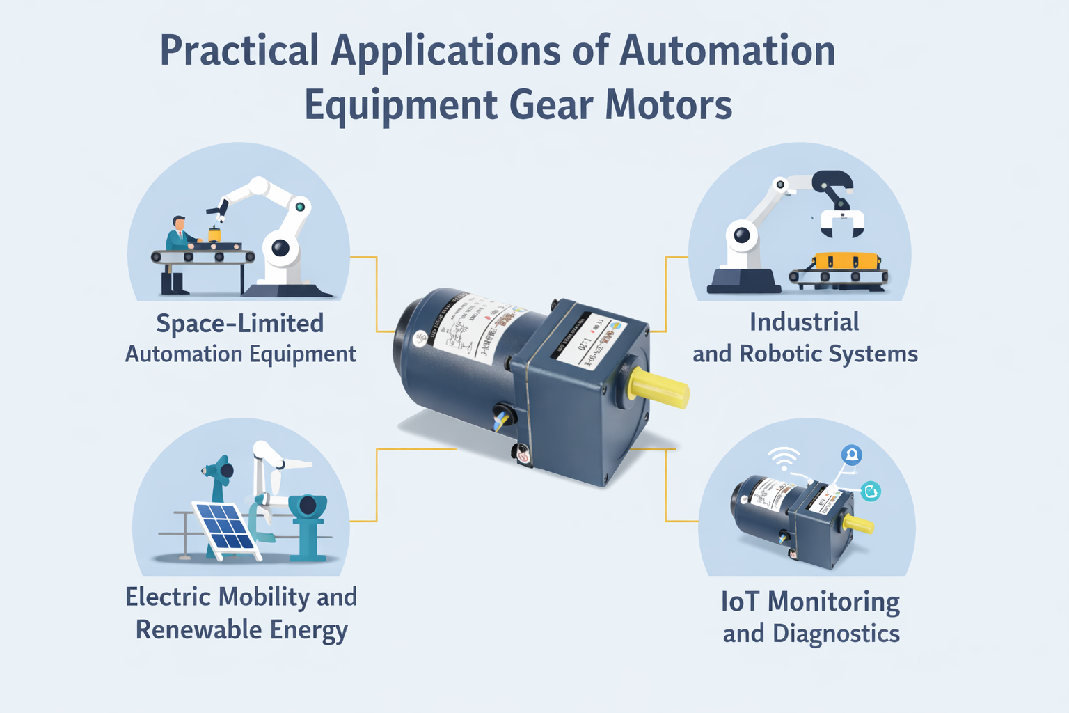 Automation gear motors are also applied in electric mobility and renewable energy systems. For example, they can drive solar tracking mechanisms, small wind turbines, or components in electric transport devices. Smooth torque output and controlled speed allow these systems to operate with minimal mechanical stress, increasing reliability and lifetime across mechanical assemblies.